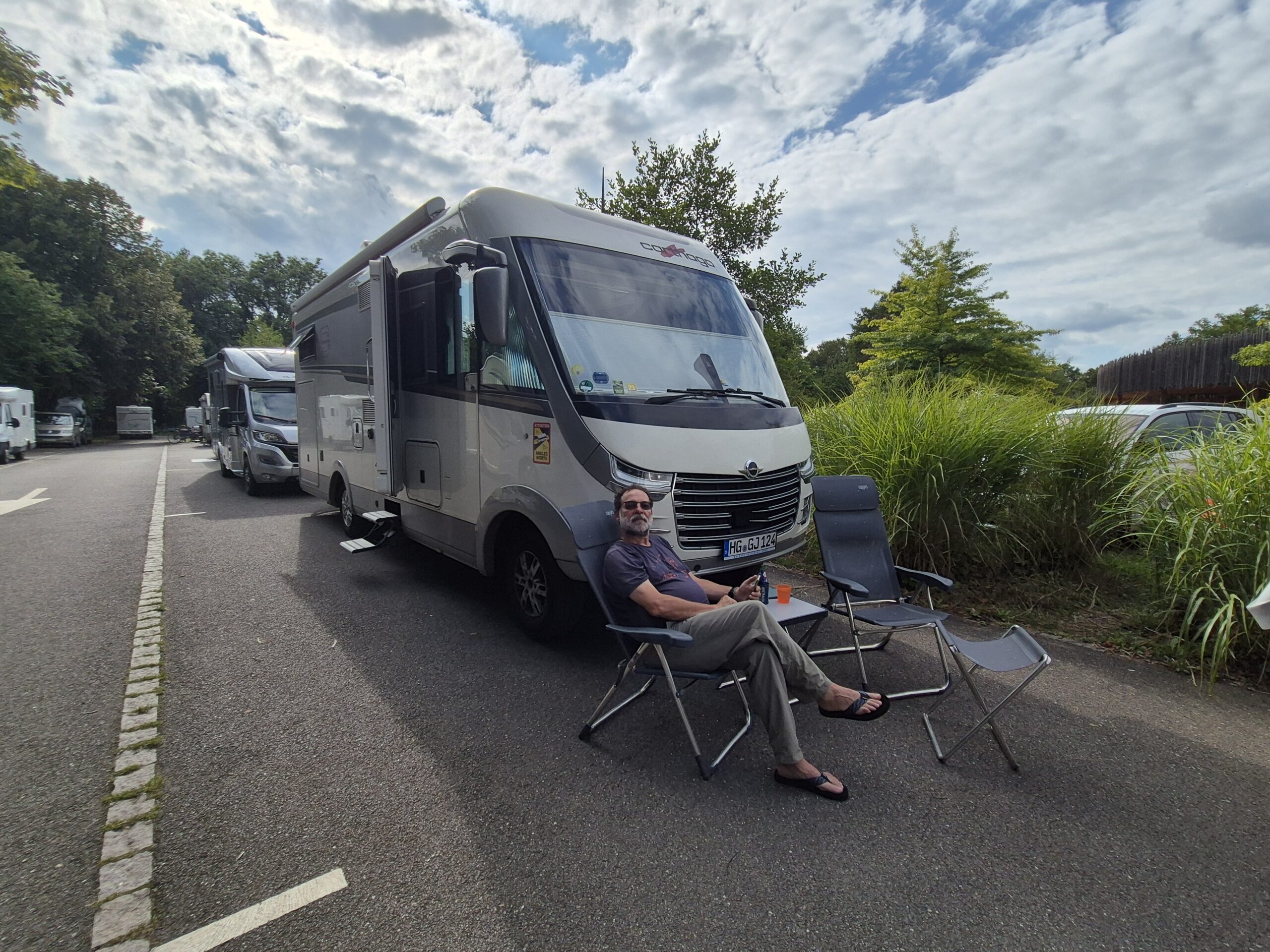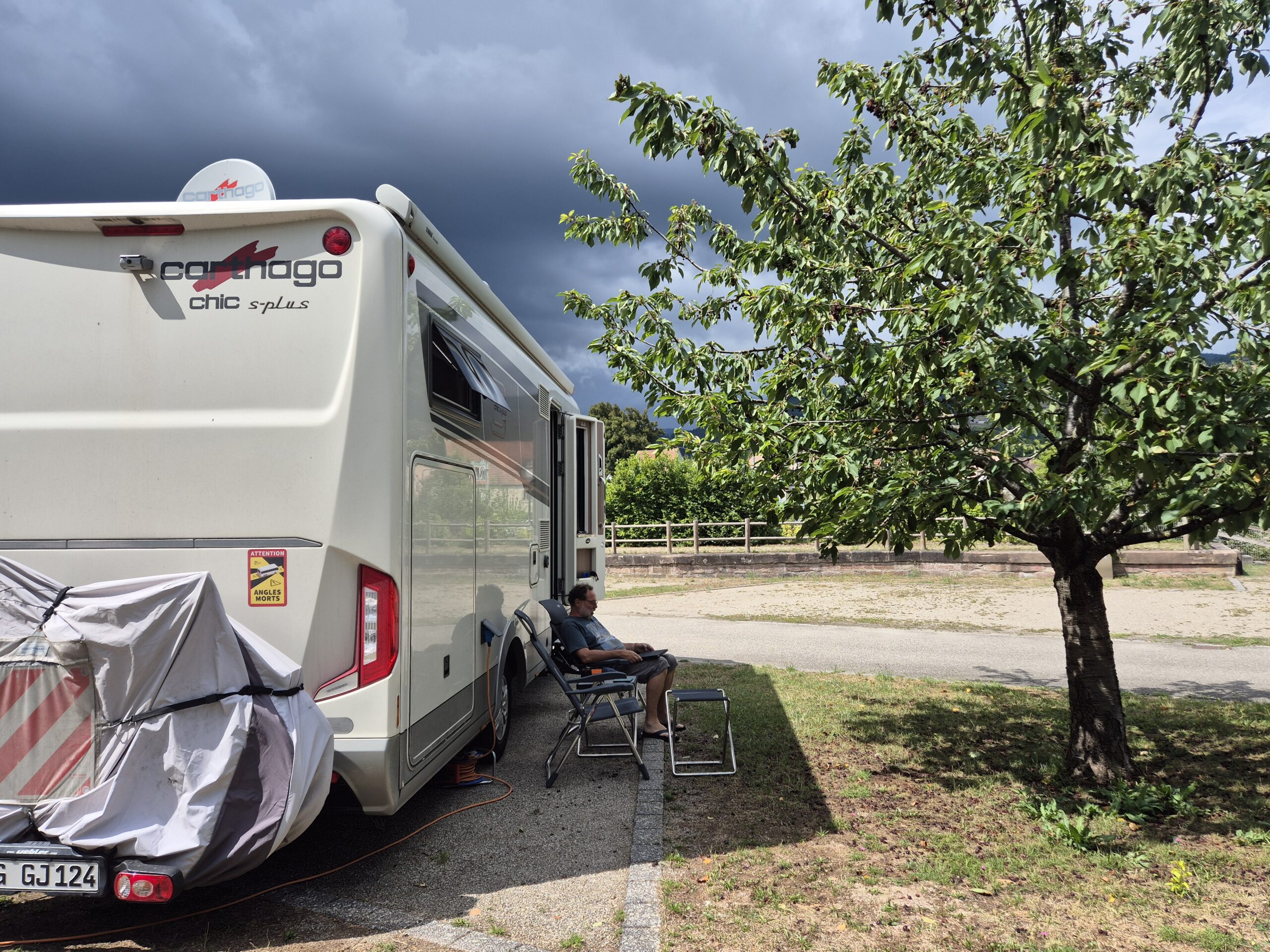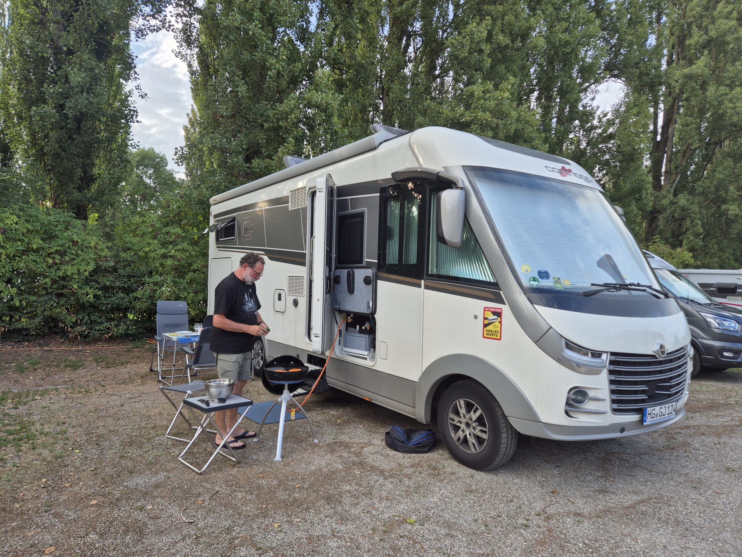Wir dagegen machen es uns auf der „Womo-Terrasse“ bequem und bewegen uns so wenig wie möglich. Auch mal schön, denn heiß ist es zudem.