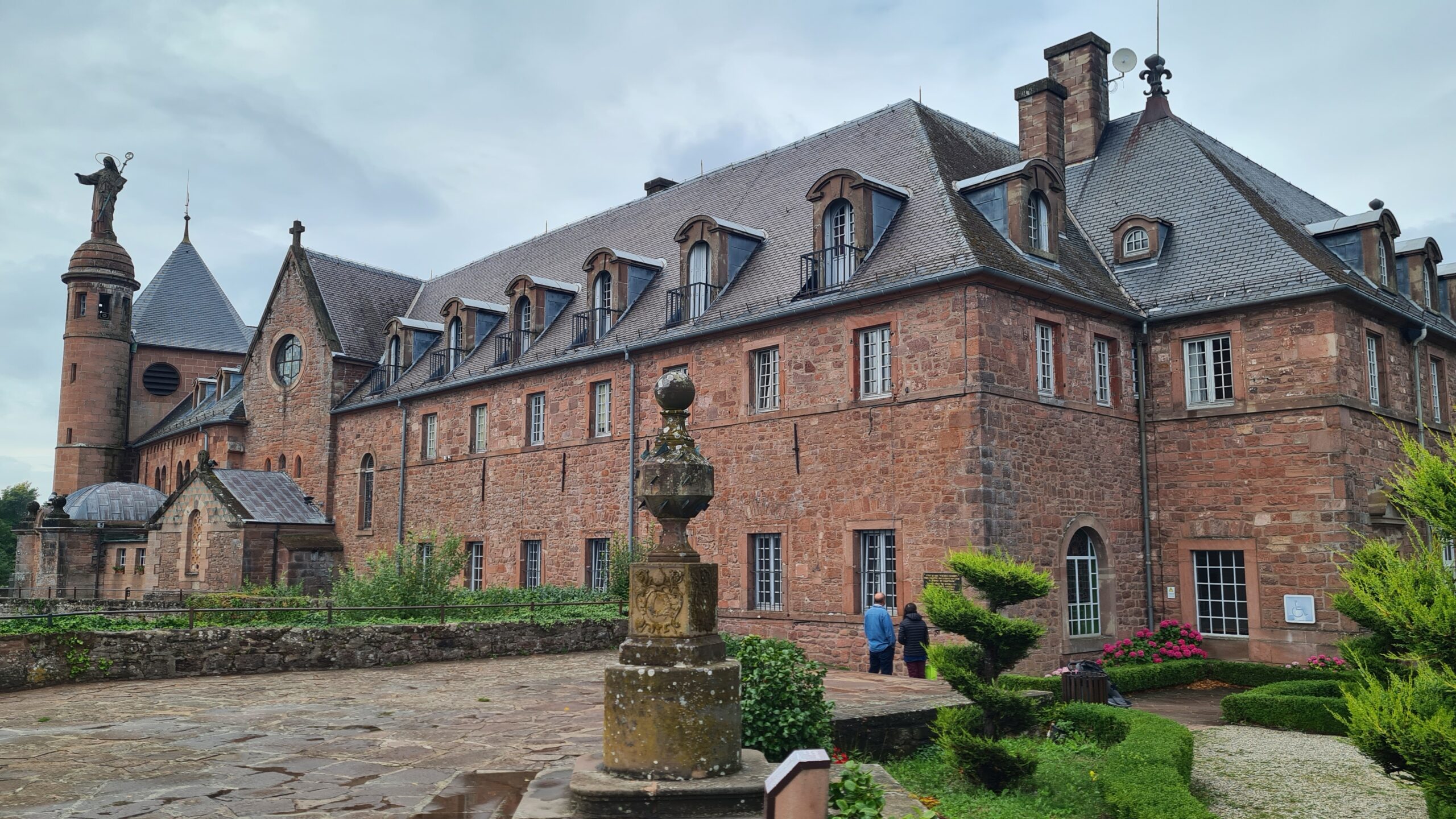 Wir finden auf dem P3 einen netten Platz für unser Womo. Das Kloster, das heute ein Hotel und Restaurant beherbergt, kann man völlig kostenfrei besichtigen. Die Aussicht ist heute leider etwas eingeschränkt. Nebelfetzen bestimmen das Bild. Das Kloster befindet sich auf hohen steil abfallenden Felsen. Die Kapelle Santuaire du Mont Sainte Odile ist offen, dort findet sich am Altar eine kleine Statuette der St. Odile.