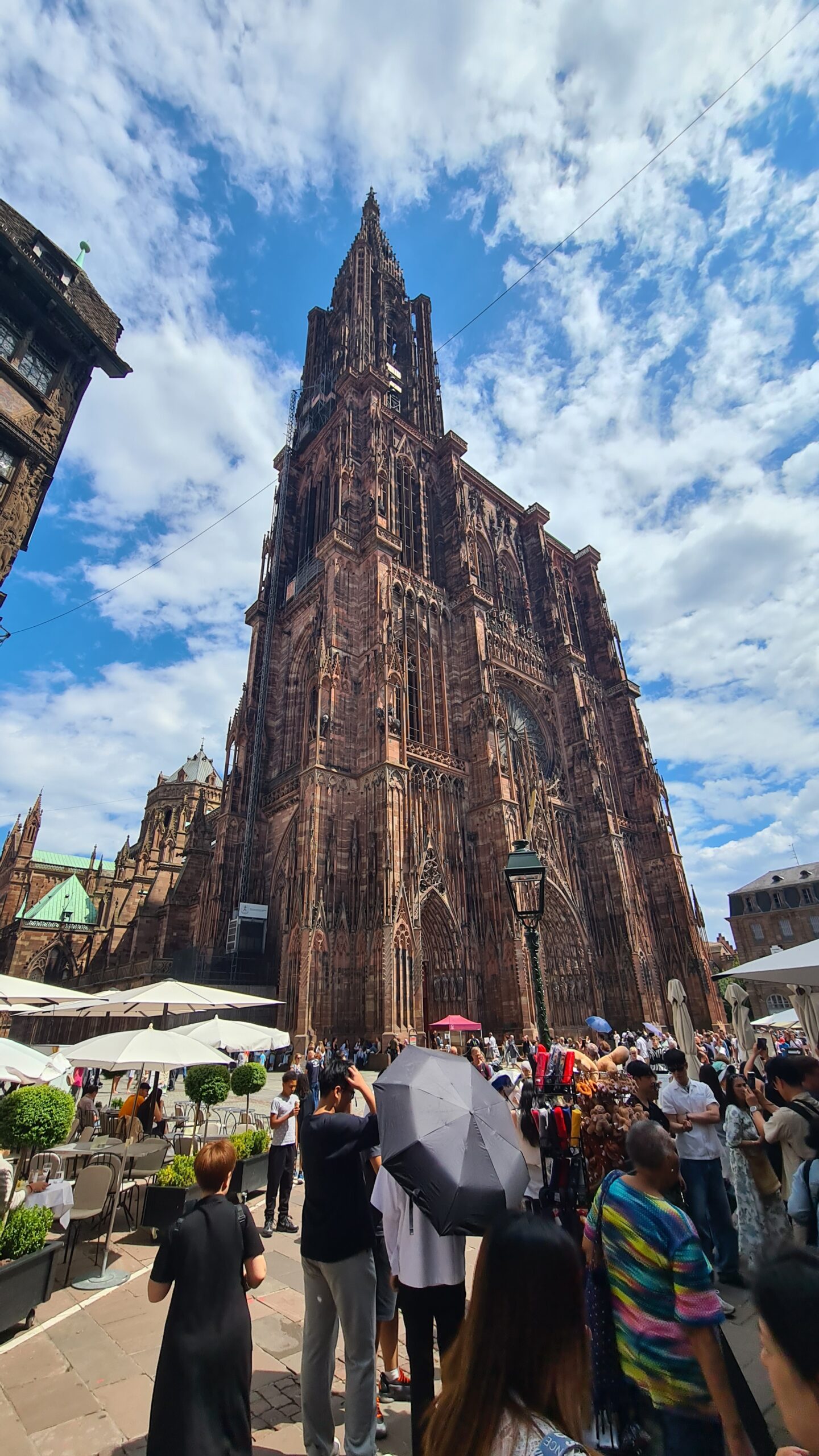 Cathédrale Notre Dame de Strasbourg: Vor der Kathedrale wartet eine lange Schlange verursacht durch Taschenkontrolle auf Einlass. Letztendlich geht es doch schnell. In der Kathedrale beeindrucken die bunten Fenster, wovon ein jedes eine andere Geschichte erzählt. Die astronomische Uhr zieht ebenfalls viele an. Alle ¼ h läuft ein Männlein.