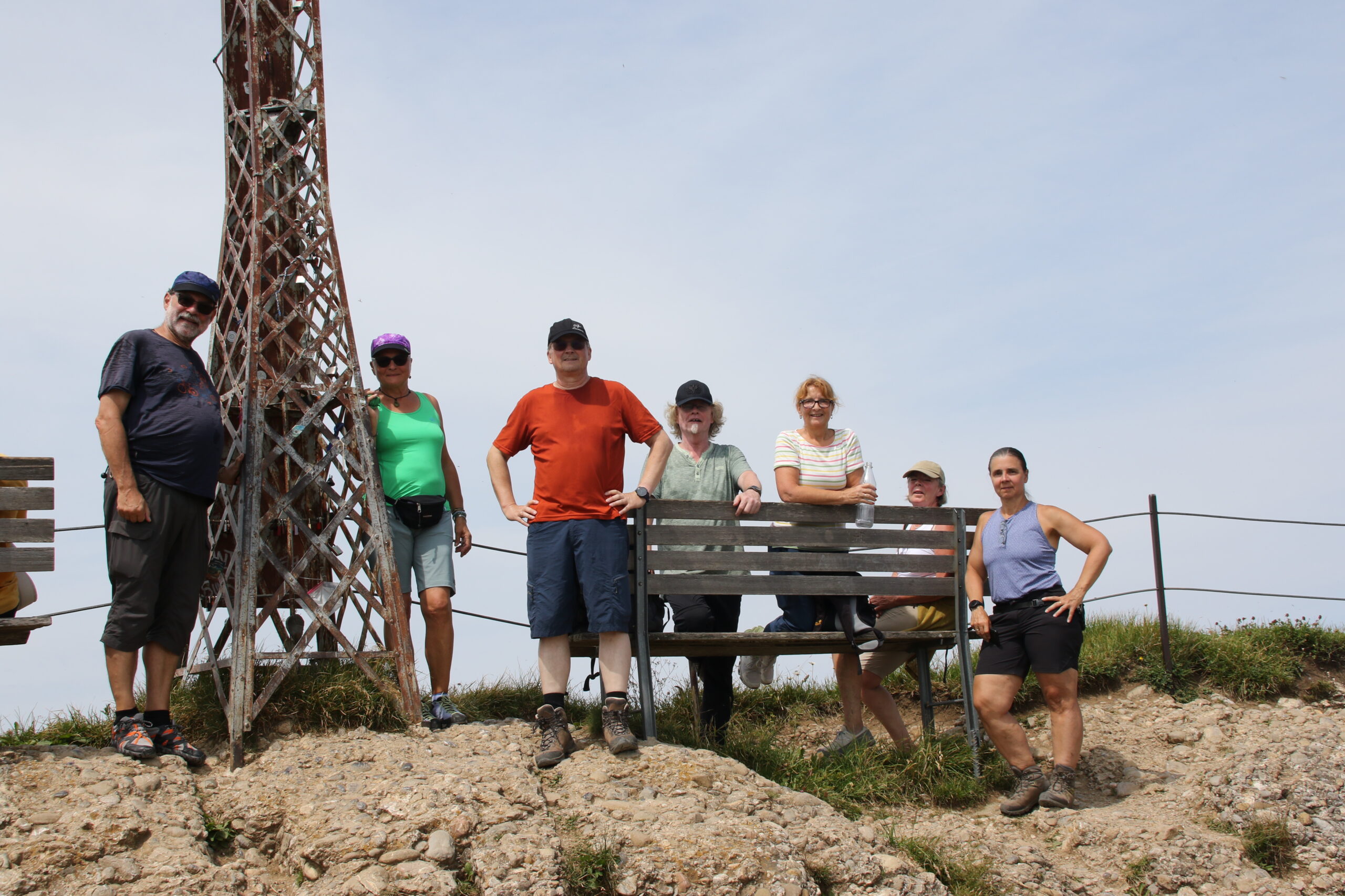 Hochgrat: kurz nach 14.00 treffen wir an der Bergstation der Hochgratbahn ein. Die Frankfurter Gruppe, die den Wanderweg hoch genommen hat, sitzt auf der Terrasse des Restaurants. Bald sind alle gestiefelt und gespornt für den letzten Aufstieg zum Gipfelkreuz. Peter mault etwas, da es ihm auf einer Seite zu steil abfällt, aber letzten Endes kommt auch er oben an. Tolle Fernsicht nach allen Seiten! Wir wählen die geschmeidigere Route für den Abstieg. Im Bergrestaurant gönnen sich einige einen Kaiserschmarrn, andere Kuchen zum Getränk. Aber die Bahn wählen alle für den Abstieg.