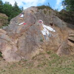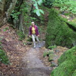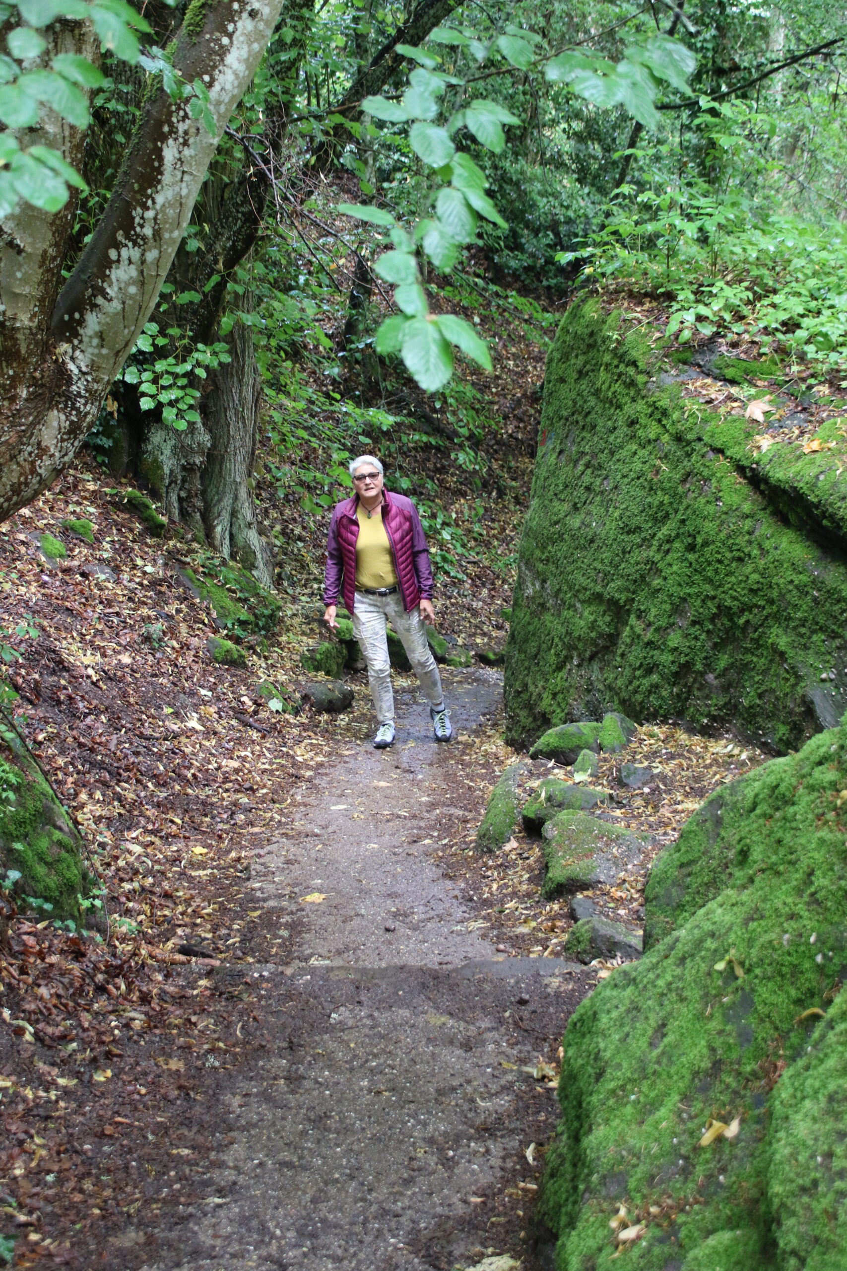 Zur Quelle führt ein Wanderweg durch Felsformationen hinab. Wir wandern über die Strasse zurück zum Womo in der Hoffnung entweder einen Blick von unten auf das Kloster zu erhaschen oder die Mur Païen zu entdecken.- Mur Païen: 11 km lange Mauer aus dem 7. Jh. Man weiß nicht, wer sie wofür erbaut hat. Vom Parkplatz findet Gabi nach wenigen Minuten ein Stück der Mauer. In jedem Fall mit viel Moos und zerfallen.