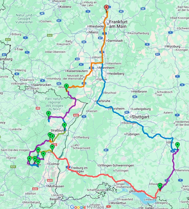 Die Bregenzer-Festspiele mit dem Freischütz als Spiel auf dem See waren der Anlass für diese Reise. Im Anschluss sind wir noch 14 Tage durch das Elsass und die Vogesen gefahren. Das Wetter war eher bedeckt und feucht als sonnig, wir konnten aber trotzdem alle Ausflüge machen, wie geplant. Auf dem Rückweg haben wir die Dahner Felsenlandschaft mit den Rädern erkundet.