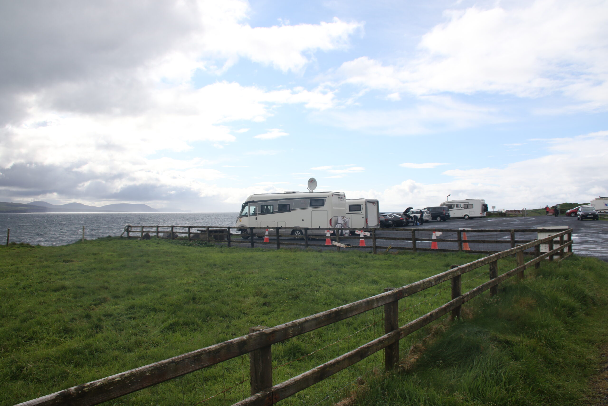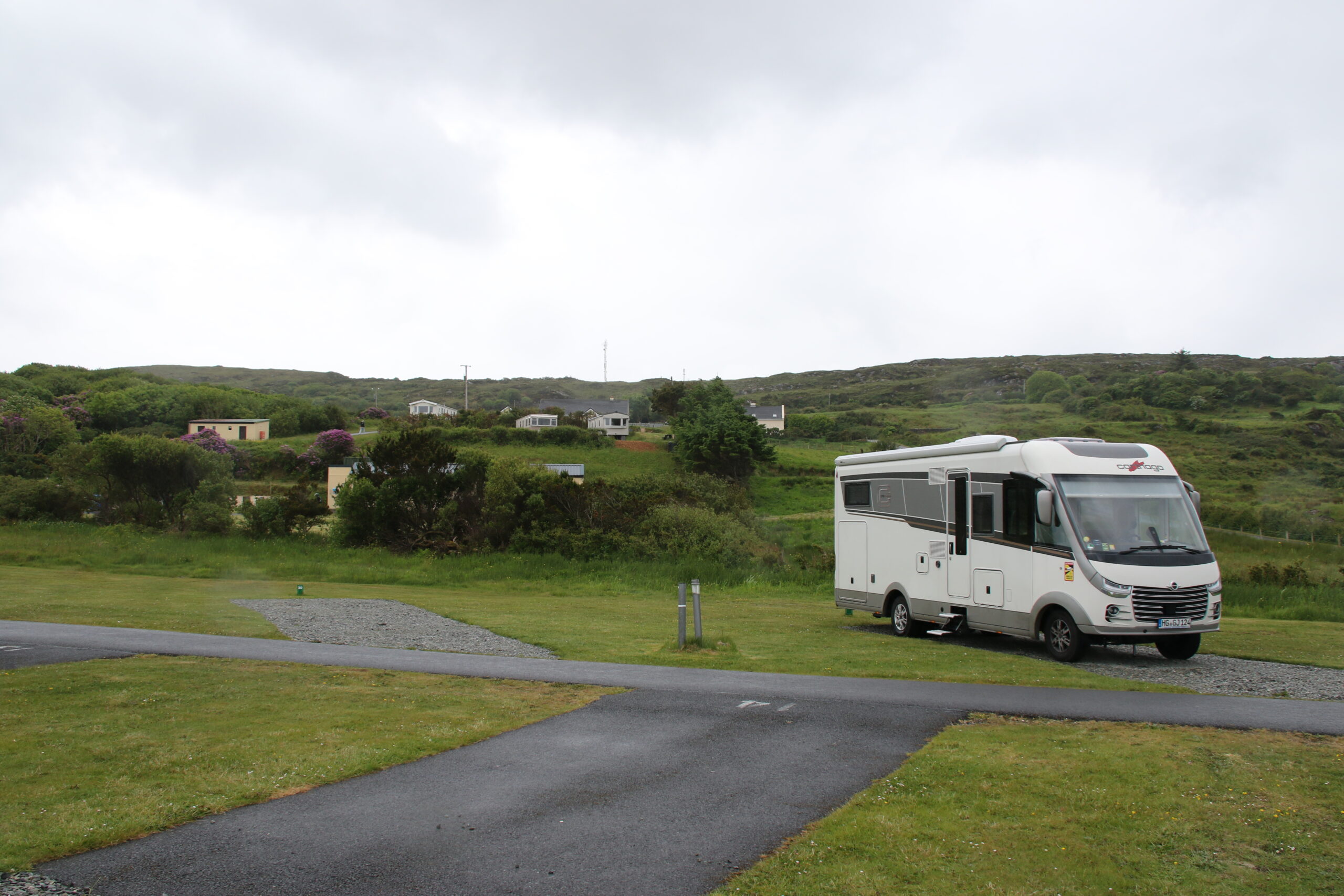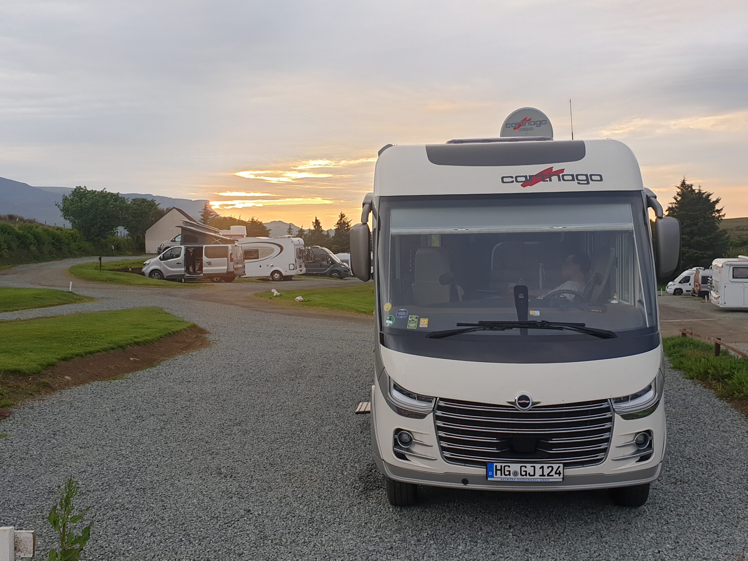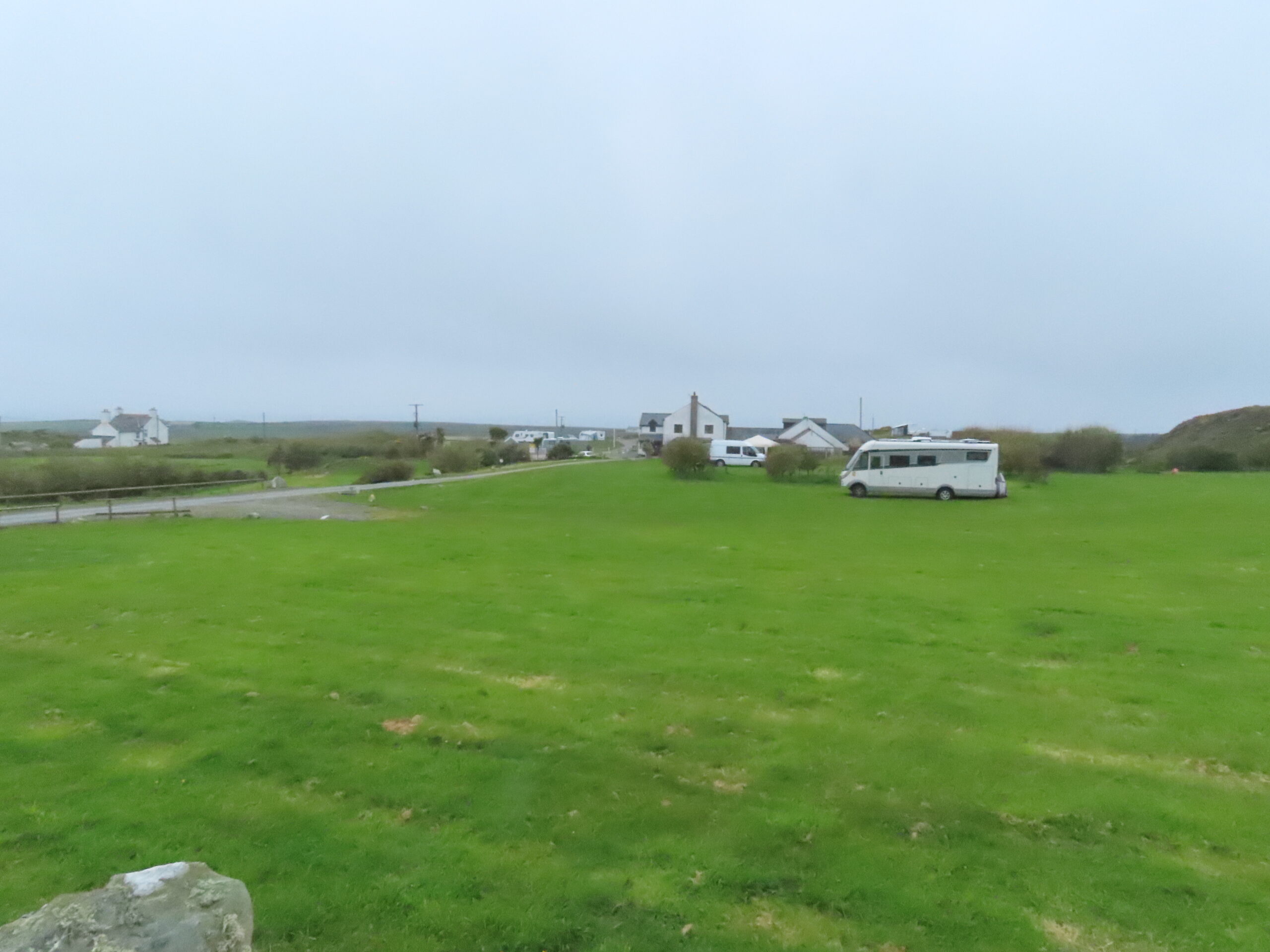 Der 1. angefahrene Stellplatz nahe dem Fährhafen behagt uns nicht, denn er ist nicht mehr in Betrieb. Der Ausweichplatz kann allenfalls als verkehrsgünstig gelegen bezeichnet werden. So landen wir in the middle of nowhere über ein schmales Sträßchen auf der Blackthorn Farm, ruhig gelegen und bei klarem Wetter sicher mit tollem Blick.