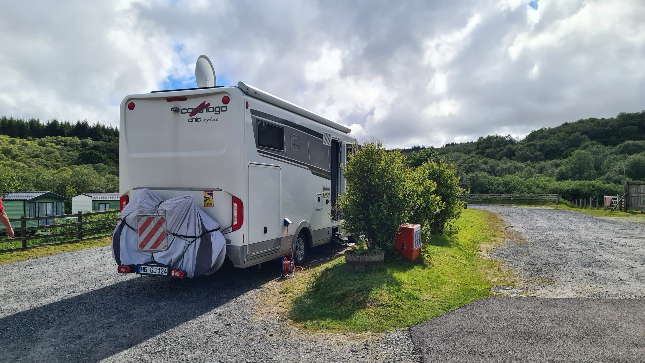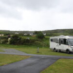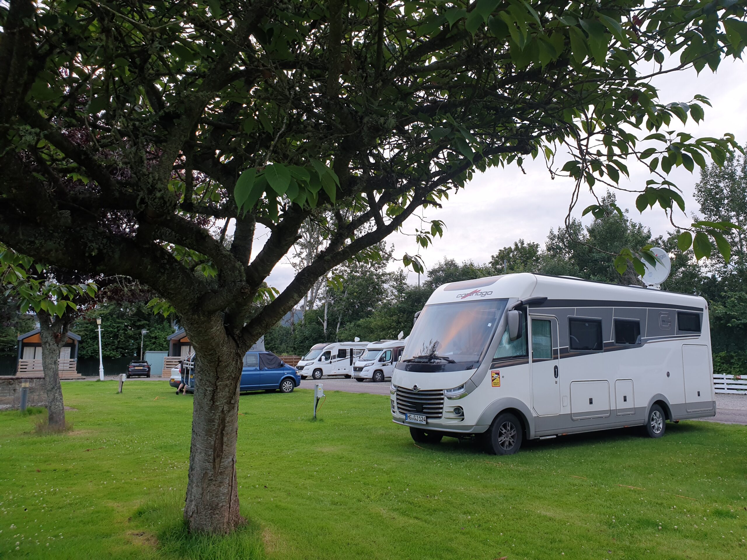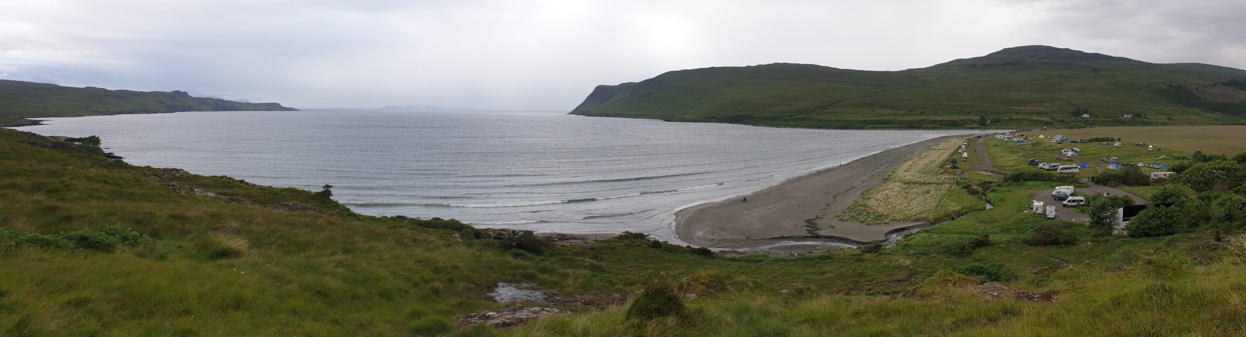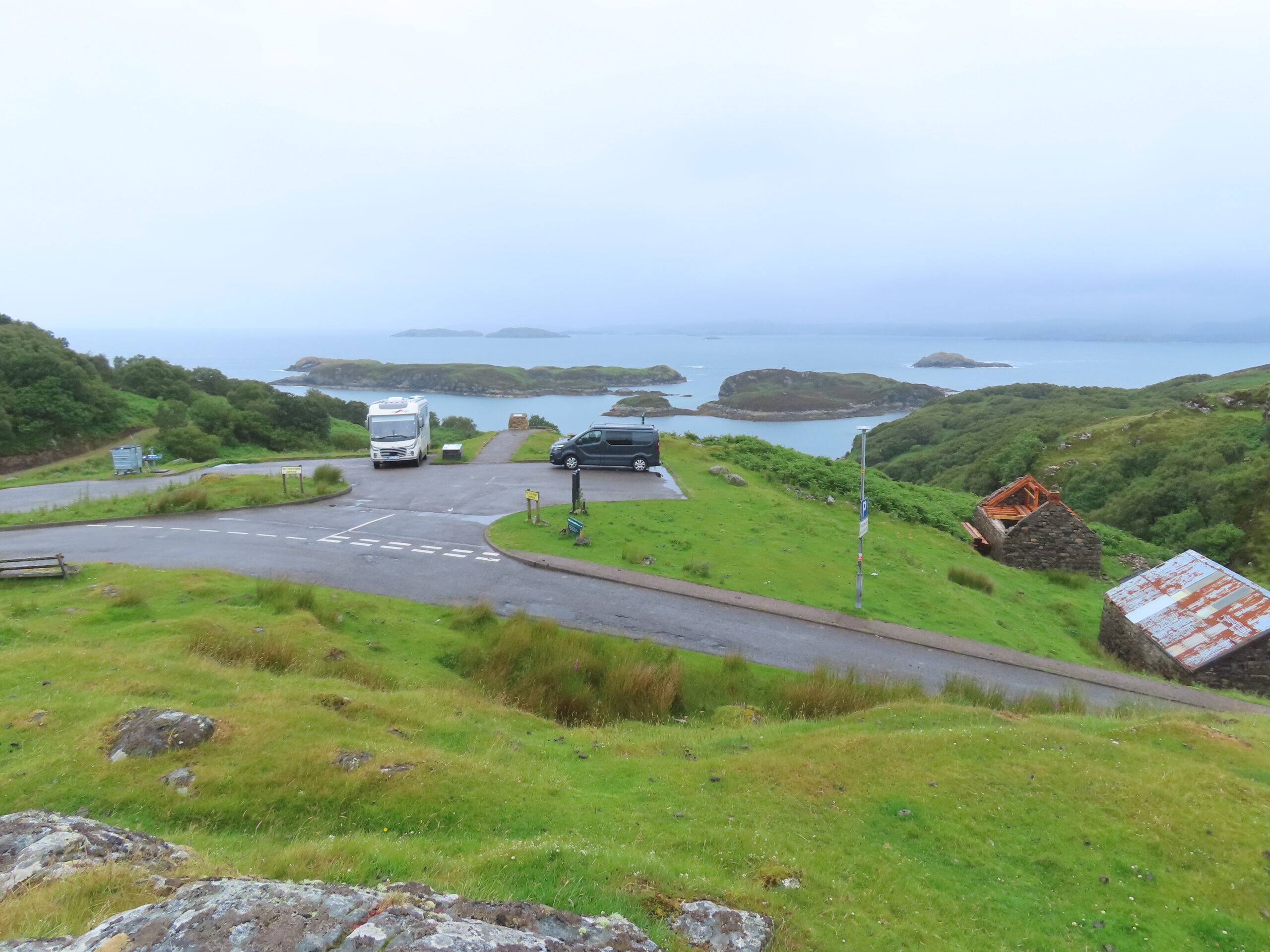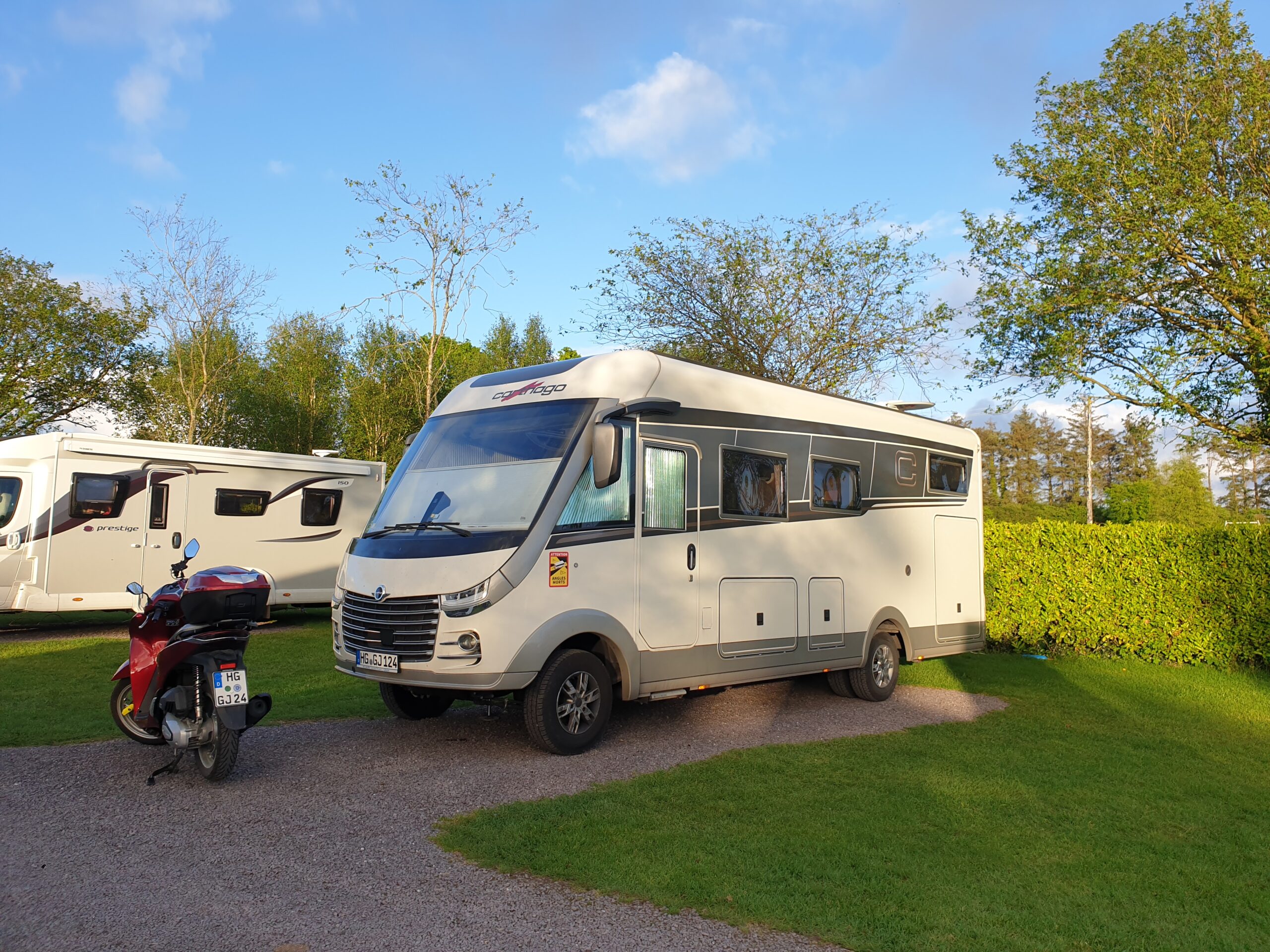 Der 1. angefahrene Stellplatz nahe dem Fährhafen behagt uns nicht, denn er ist nicht mehr in Betrieb. Der Ausweichplatz kann allenfalls als verkehrsgünstig gelegen bezeichnet werden. So landen wir in the middle of nowhere über ein schmales Sträßchen auf der Blackthorn Farm, ruhig gelegen und bei klarem Wetter sicher mit tollem Blick.