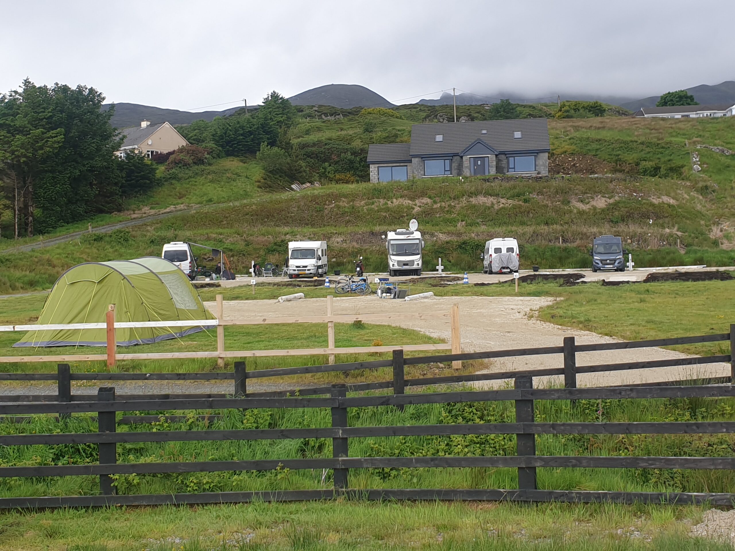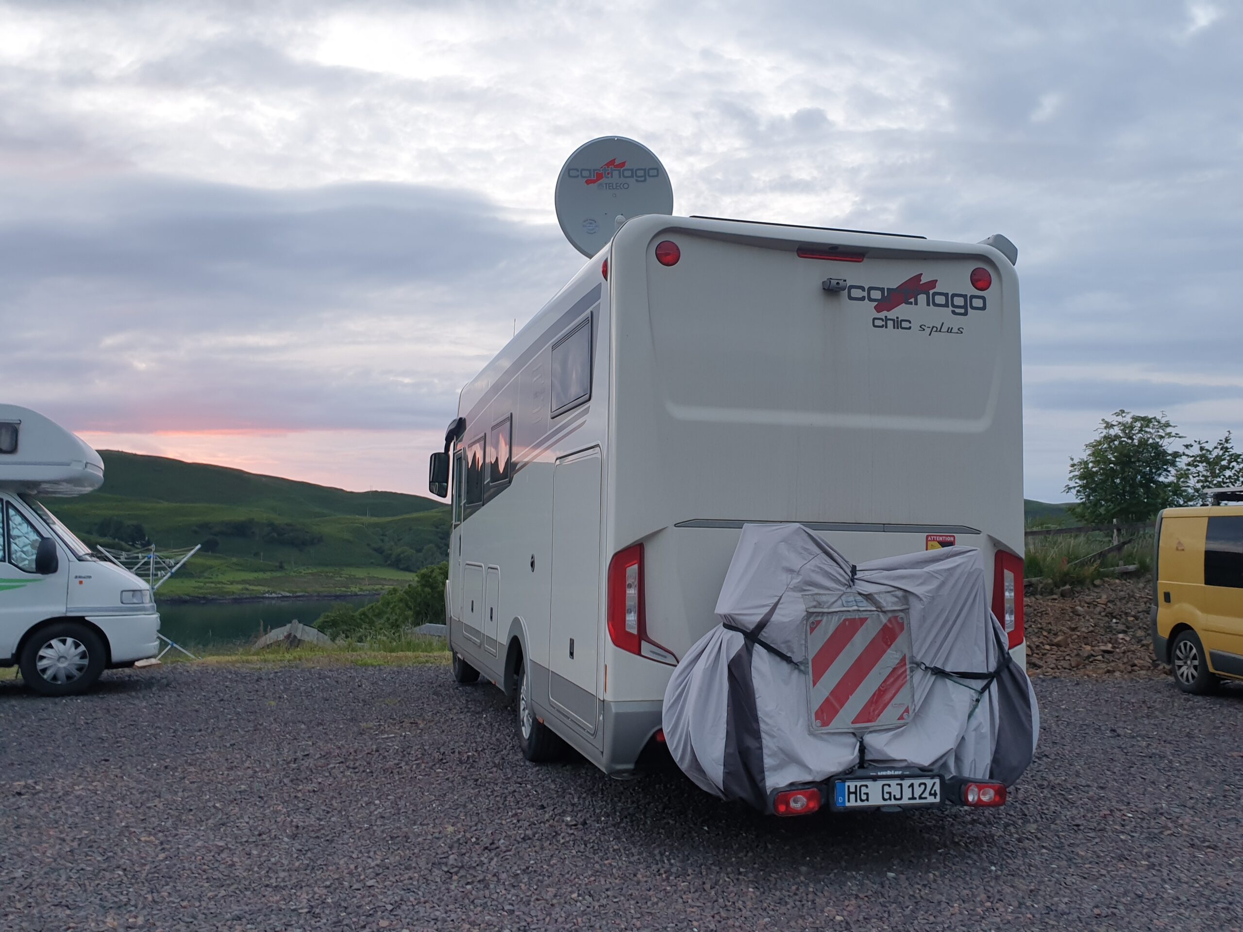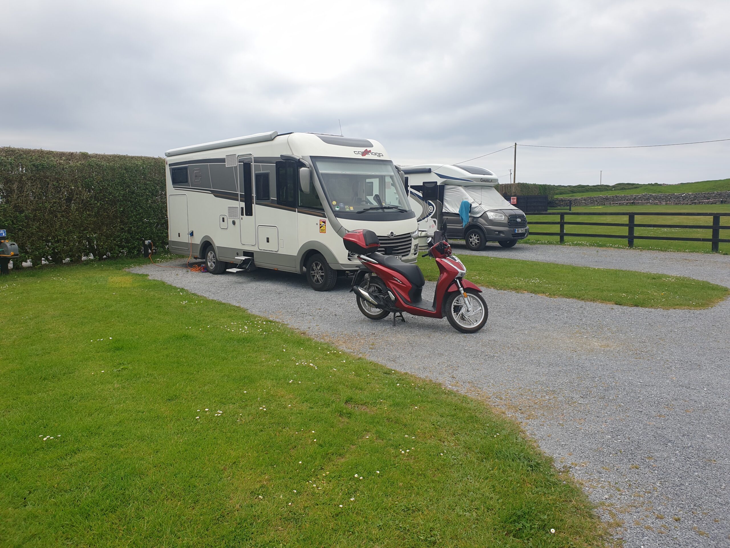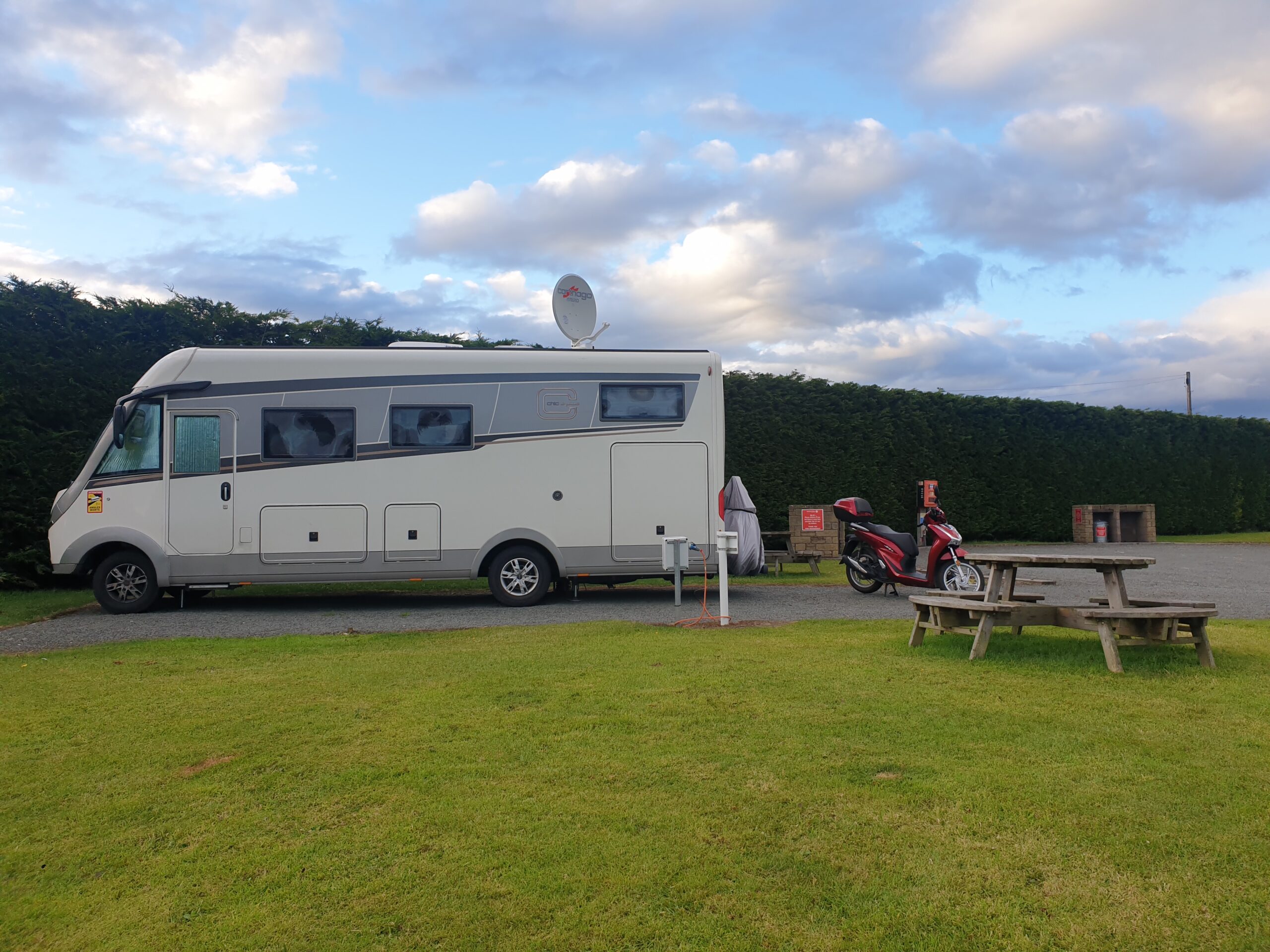 Der 1. angefahrene Stellplatz nahe dem Fährhafen behagt uns nicht, denn er ist nicht mehr in Betrieb. Der Ausweichplatz kann allenfalls als verkehrsgünstig gelegen bezeichnet werden. So landen wir in the middle of nowhere über ein schmales Sträßchen auf der Blackthorn Farm, ruhig gelegen und bei klarem Wetter sicher mit tollem Blick.