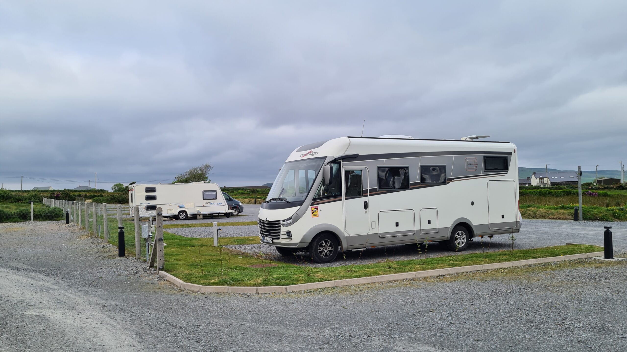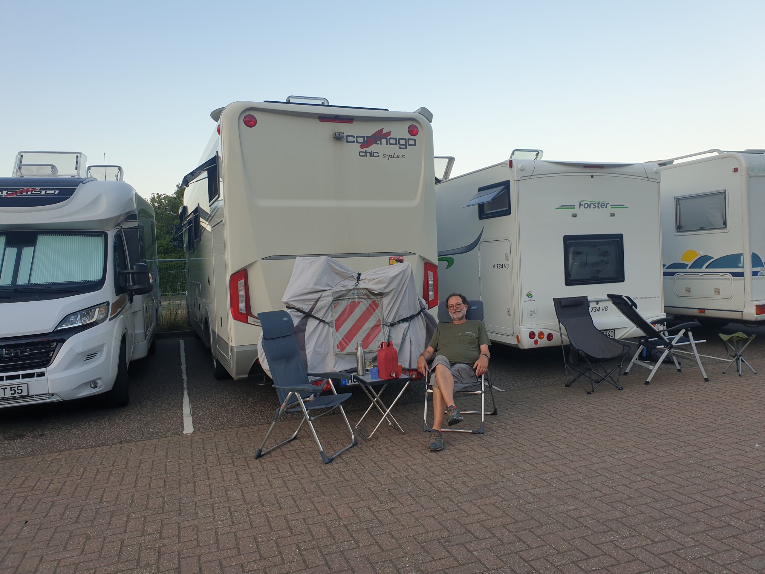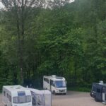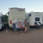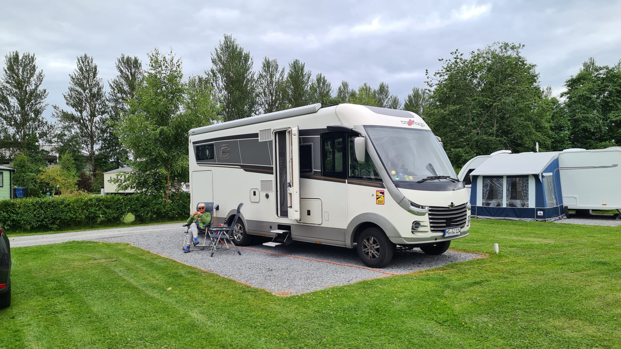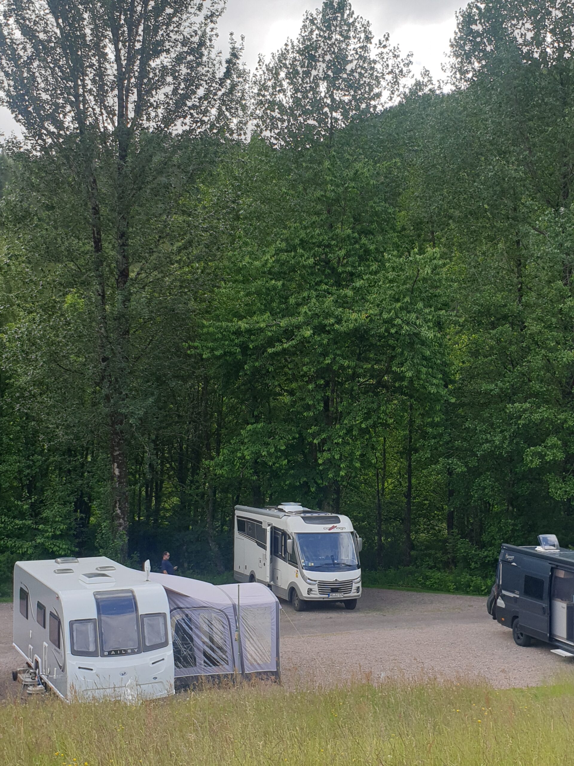 Der Schotterplatz hat Neigung aber reichlich Platz für alle. Im Laufe des Tages finden sich weitere Womos ein.