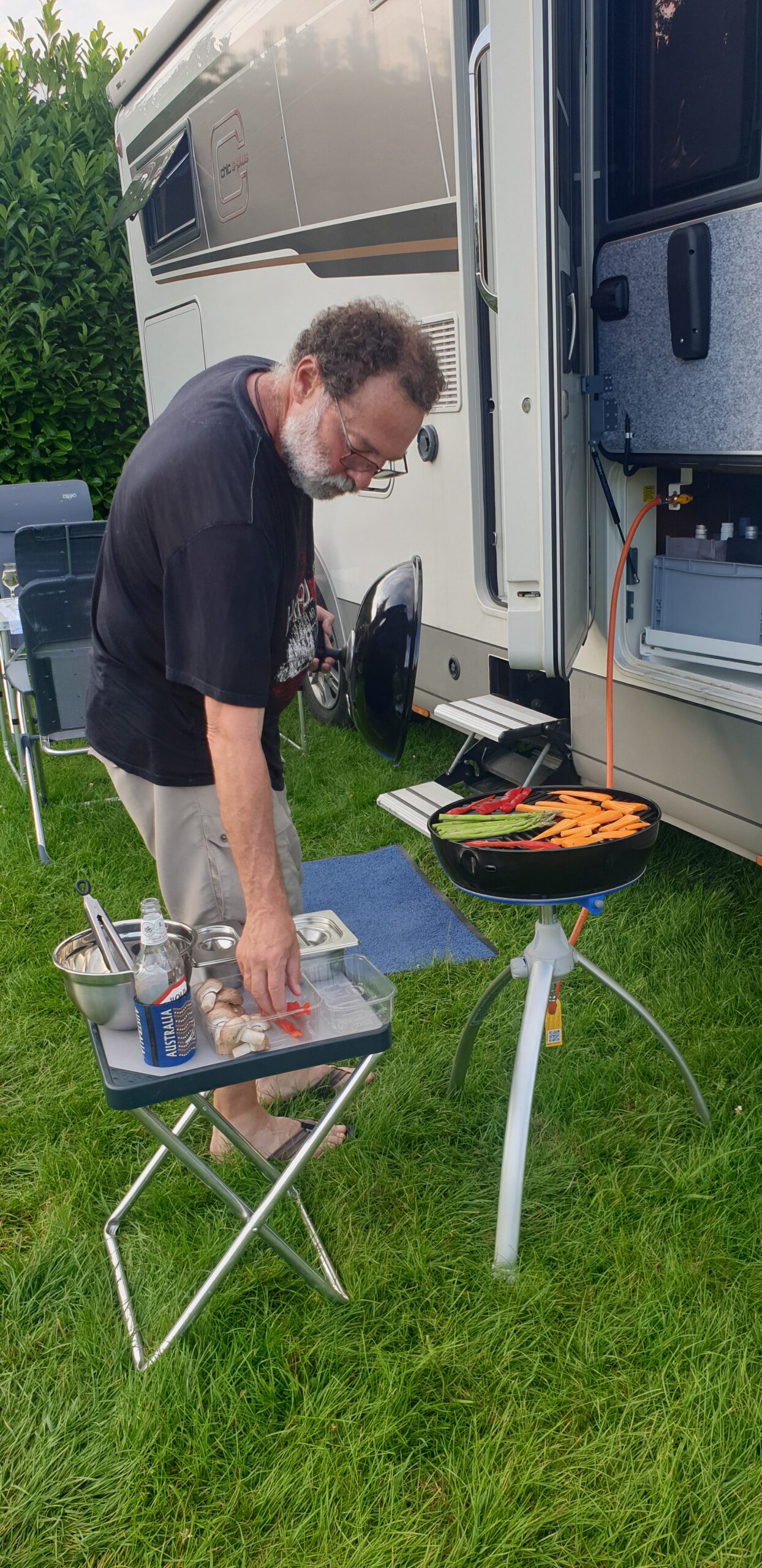 Abendessen: Chez Mossels: Heute wird der Grill angeworfen. Wir haben noch Seebrassenfilets im Tiefkühler, dazu kommt ein guter Teil des Gemüses auf den Grill. Tomaten-Radieschen-Salat und Knoblauchöl ergänzen das leckere Mahl.