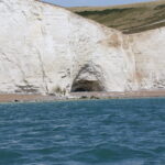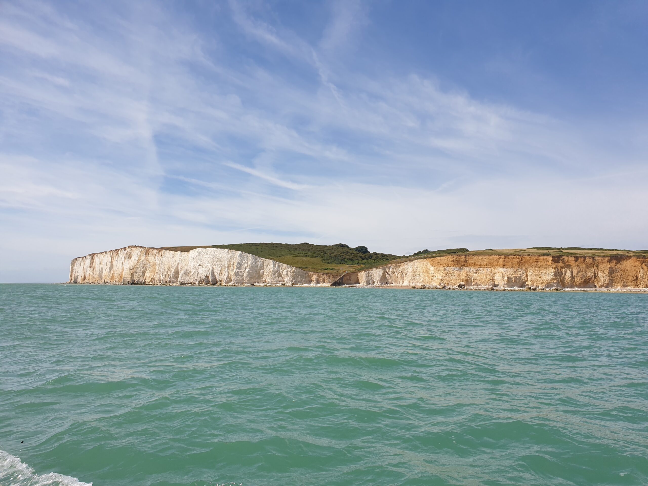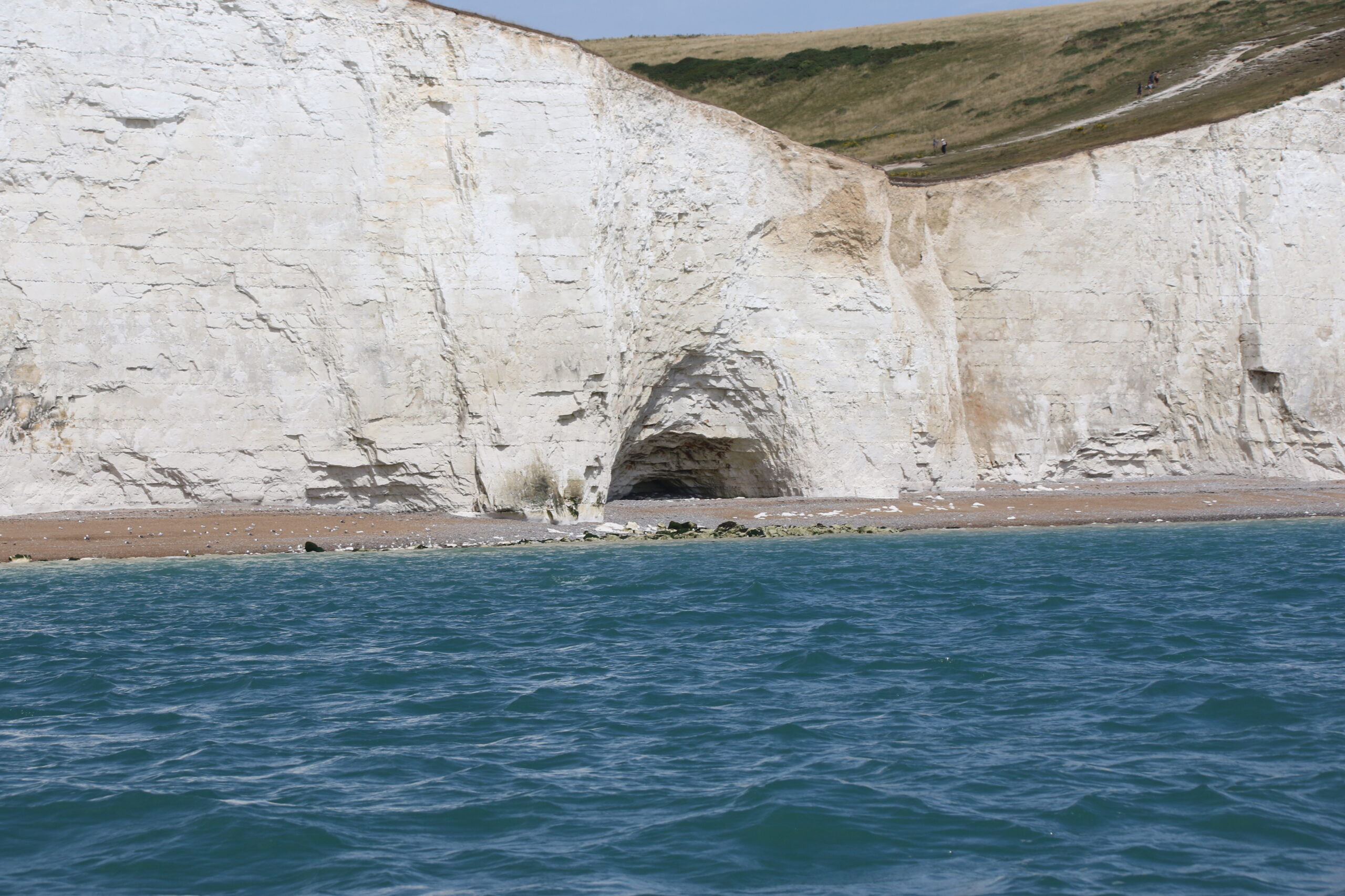 Über die Kreidefelsen führt ein Wanderweg, aber am besten lassen sich die Klippen von der Seeseite aus sehen. Wir fahren mit einem Speedboot von Newhaven aus zu den Seven Sisters. Ein Seehund tummelt sich in einer Bucht.