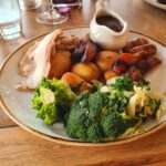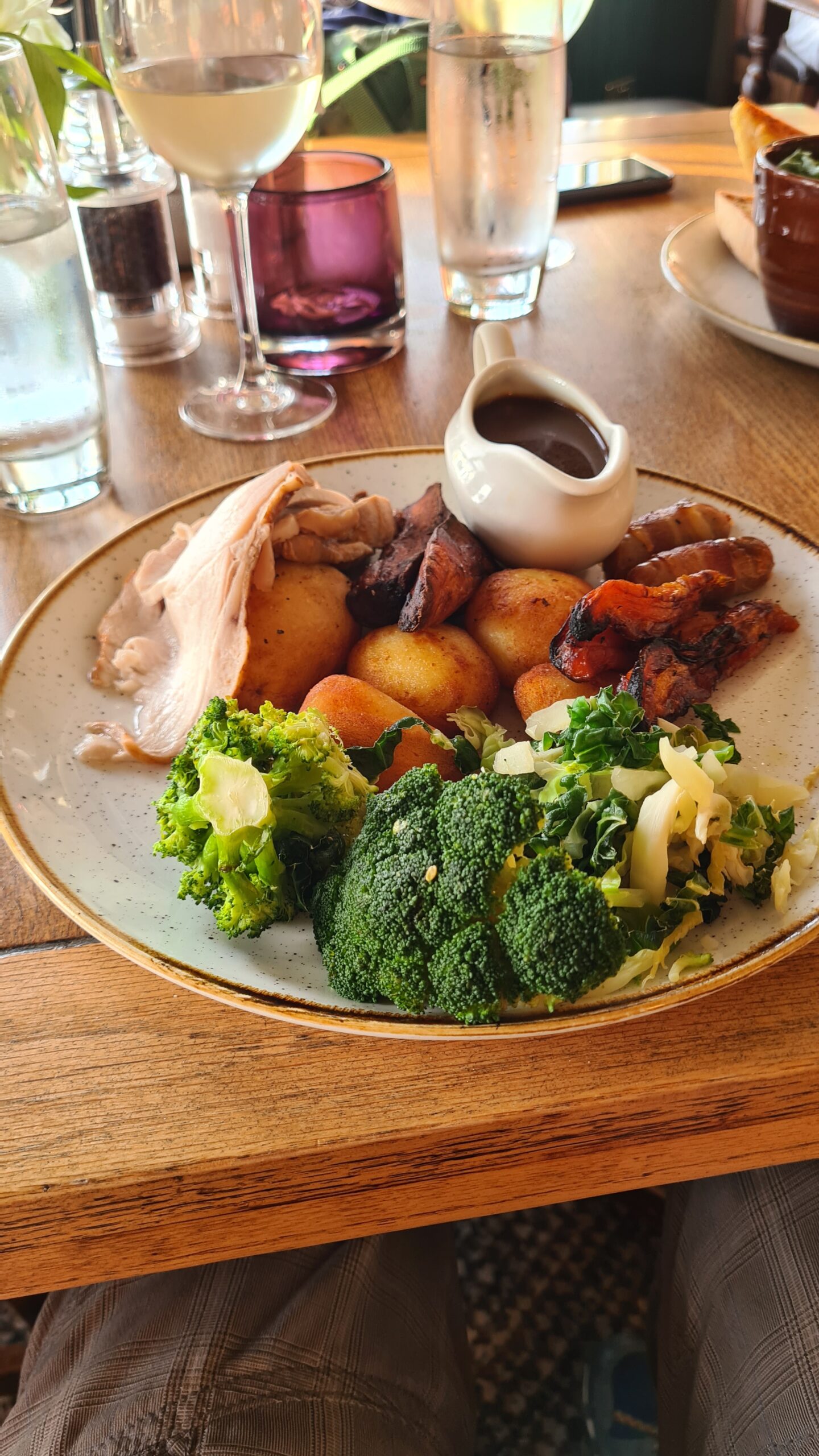 Abendessen: Beachy Head Pub: superschön gelegen. Auf der einen Seite grasen die Kühe auf der anderen Seite die Klippen mit dem Leuchtturm Belle Tout. Wir sitzen an einem schönen Tisch mit Aussicht über das weite Land, Wiesen und Kuhherde. Das Essen ist ganz in Ordnung, der Service bemüht. Aber die Lokation einfach eine Wucht!